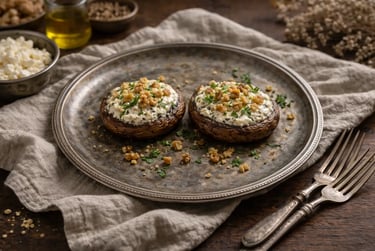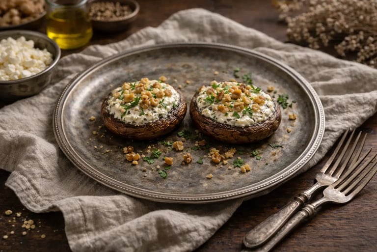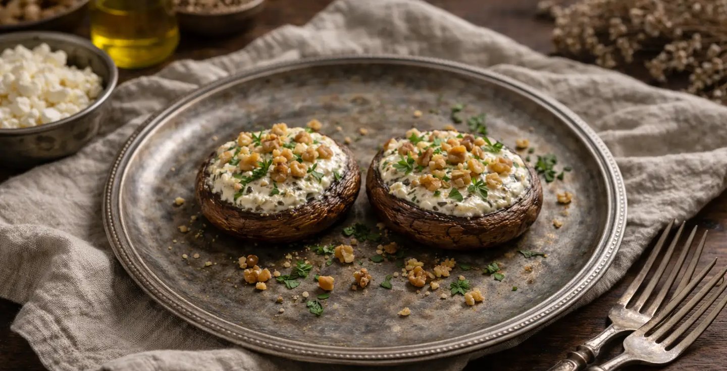 Les champignons apportent fibres et minéraux, la féta et le yaourt grec des protéines et du calcium, tandis que l’huile d’olive et les noix fournissent de bons acides gras. Une entrée simple, rassasiante et équilibrée.