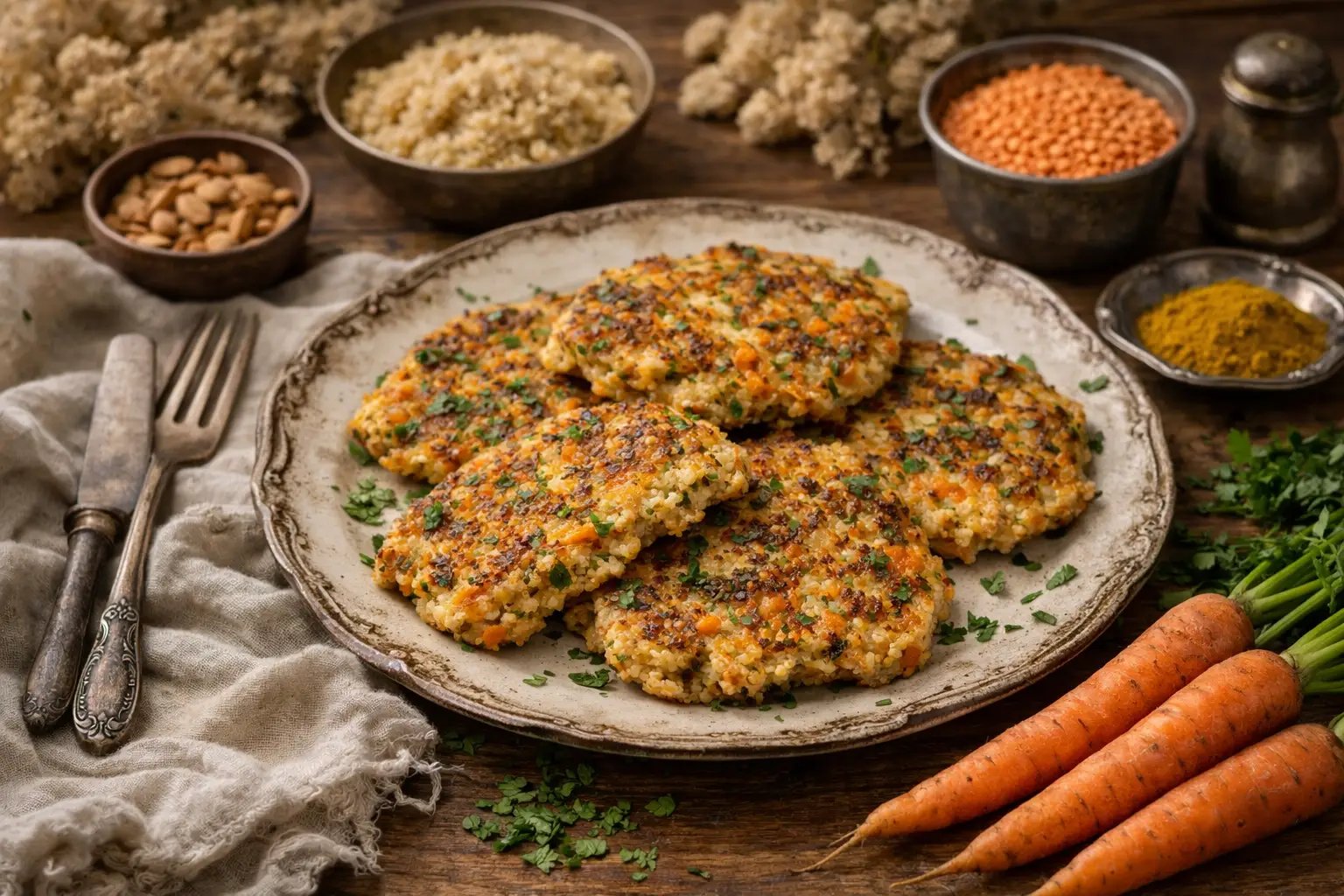 Galettes au quinoa, lentilles corail, carottes et au curry doux