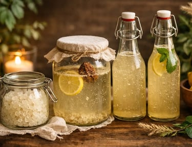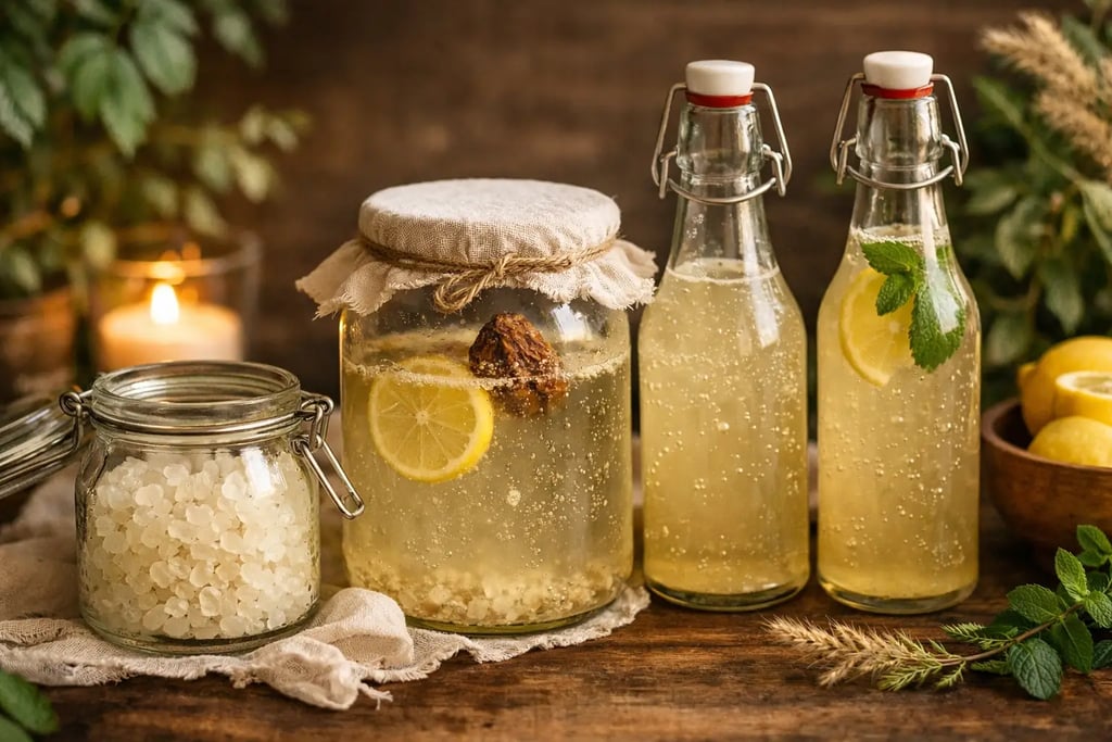 Sous ses bulles légères se cache un monde invisible : levures, bonnes bactéries, ferments bienveillants qui transforment doucement une eau sucrée en un nectar pétillant et légèrement acidulé.